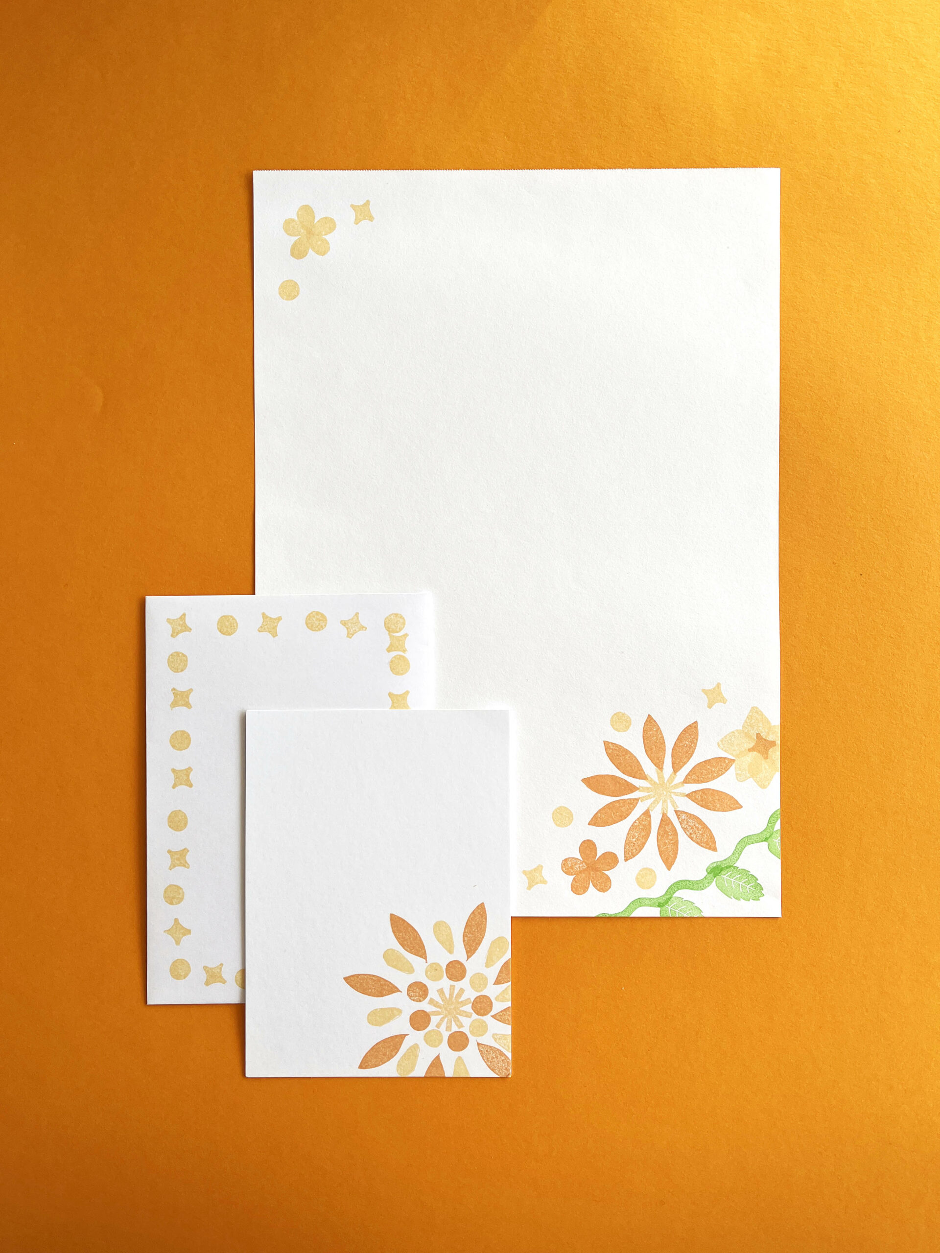 Tout le matériel est fourni : papier du A6 au A4, enveloppes, tampons et encres.