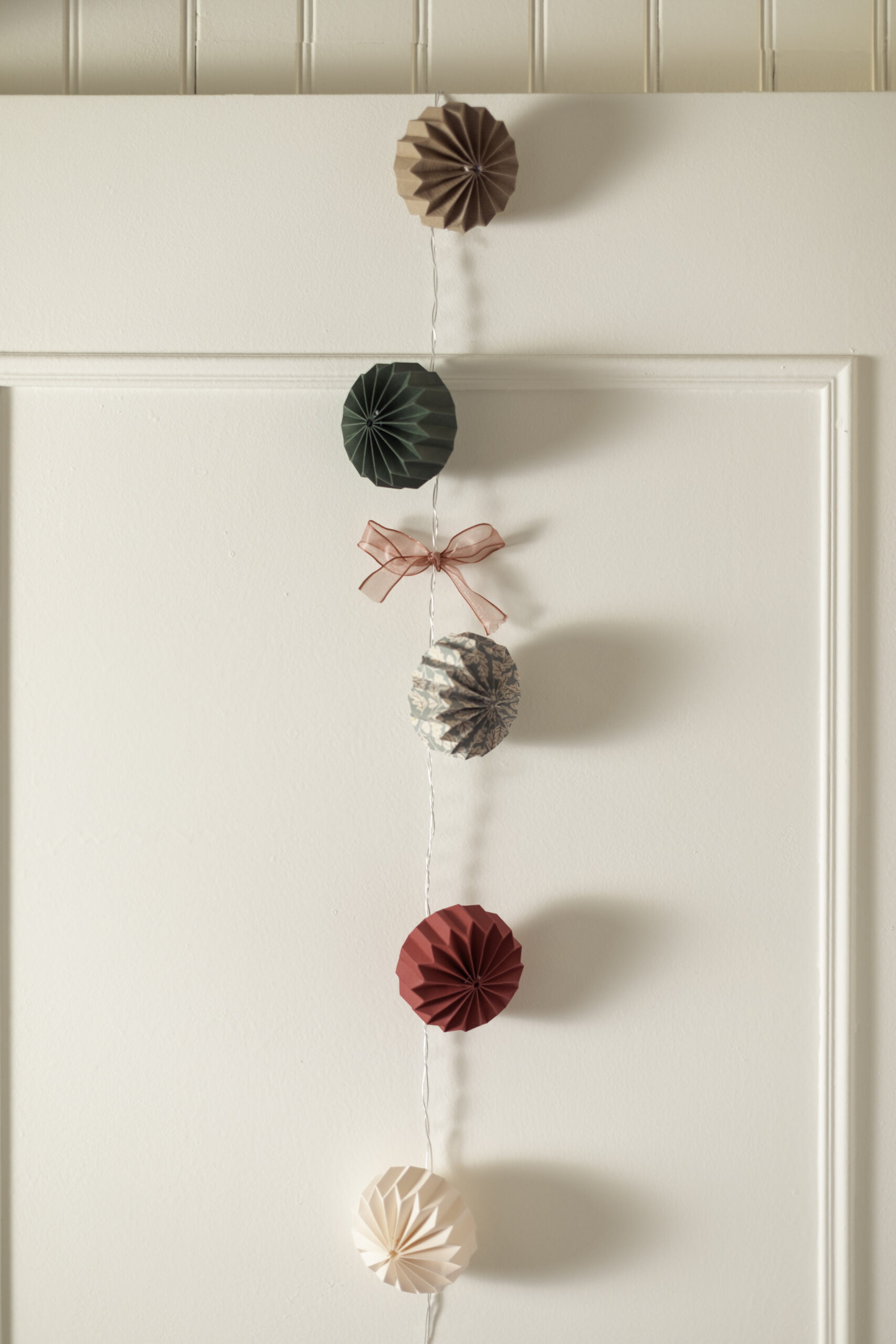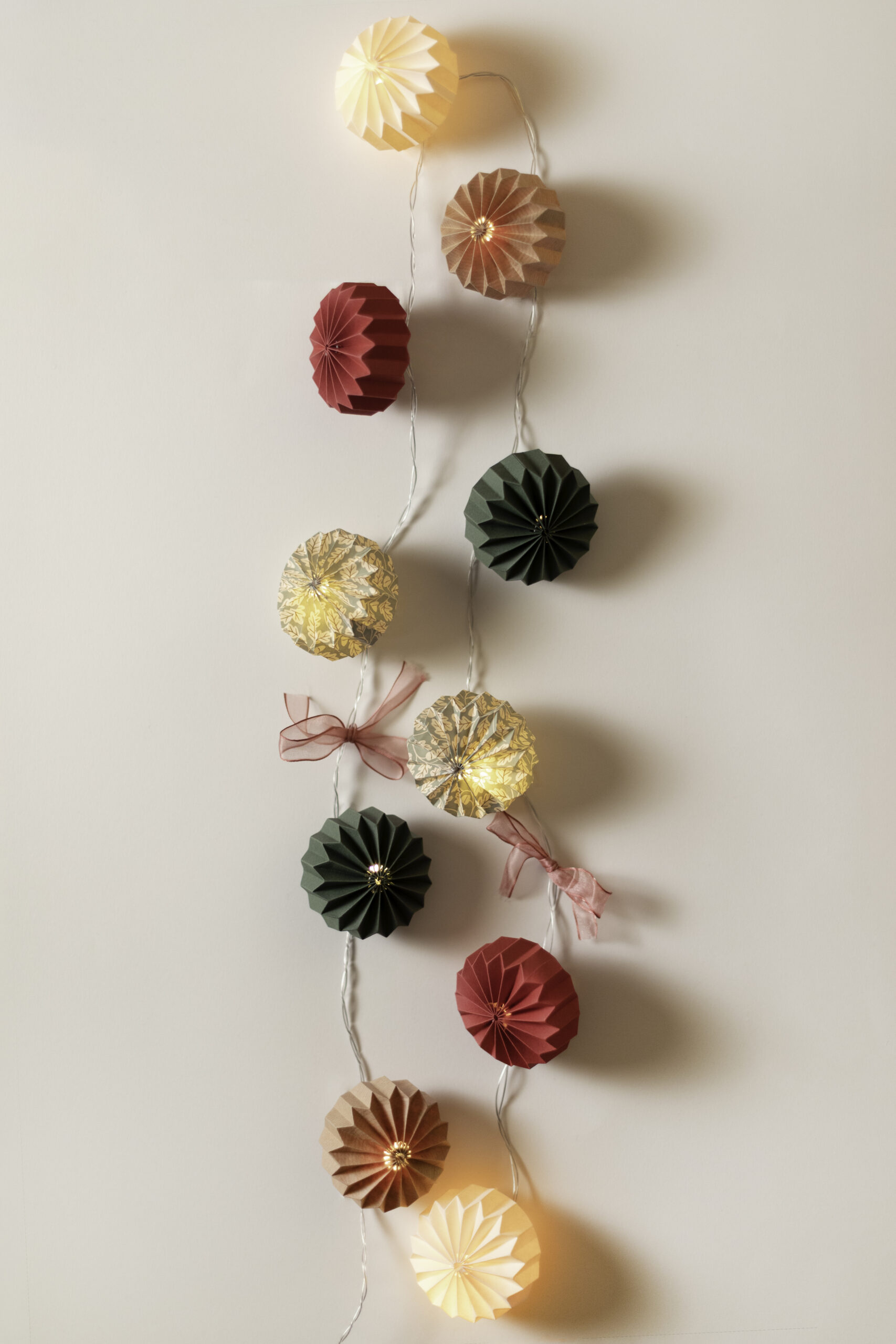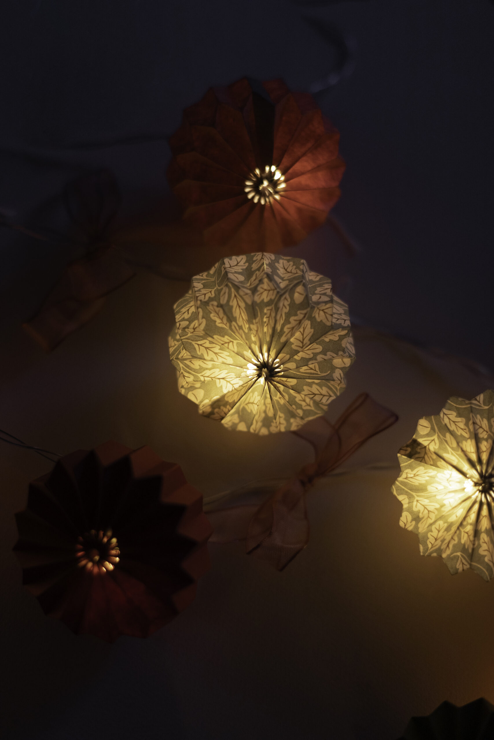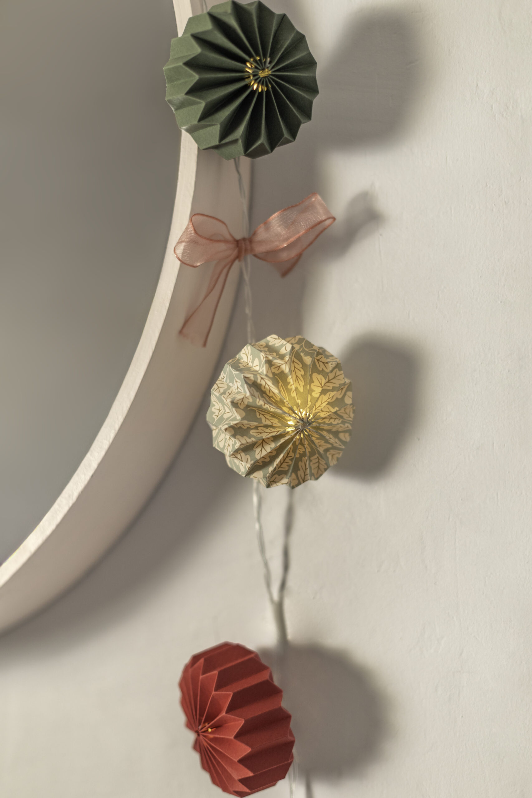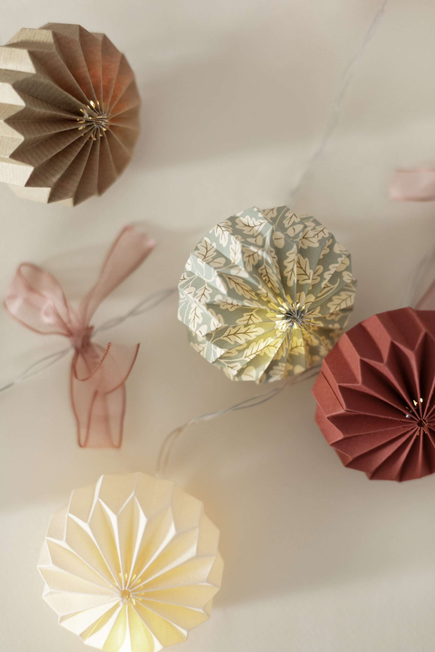 En deux heures, vous apprendrez à plier et assembler les éléments d’une guirlande lumineuse origami de 10 lampions, aux couleurs de Noël :